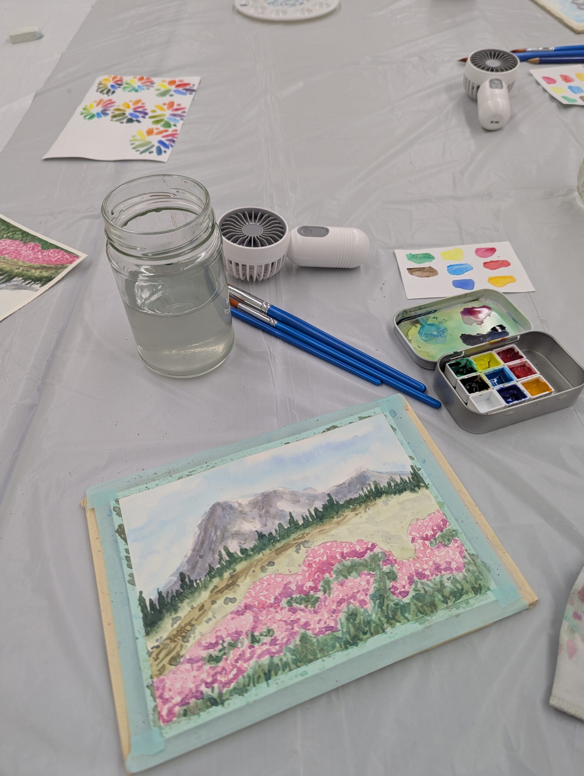 Classes are 2 hours long, and are $30 per participant. All materials are provided, and at the end of every class each student takes home a 5×7 watercolor painting (or bookmark) they made themselves!
